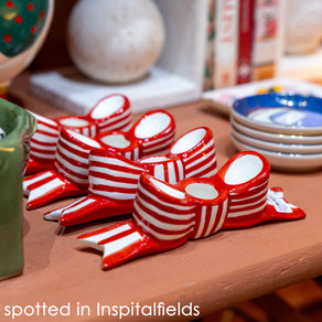 Add a charming twist to your table décor with this Bow Ceramic Candle Holder. Featuring a sculptural ceramic bow shape in a striped finish, this elegant holder brings a touch of playful sophistication to any tablescape or mantle. Designed to fit a standard dinner candle, it’s both functional and decorative.
