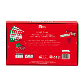 Contains 100 Bingo sheets, 48 Christmas calling cards, 8 Bingo paddles and 1 lucky dip bag