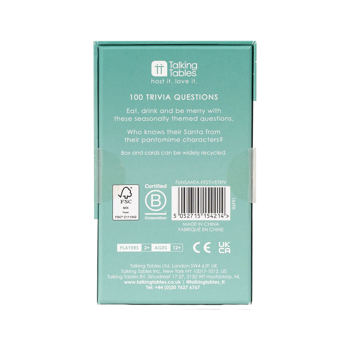 Help customers bring fun to the table this Christmas with the new Talking Tables Festive Trivia game. With questions about holidays, celebrations and traditions, this game is great as an ice-breaker or as a welcome interlude between courses. Our Christmas Festive Trivia Game comes in a box slightly larger than a deck of playing cards and features 50 cards with questions front and back.