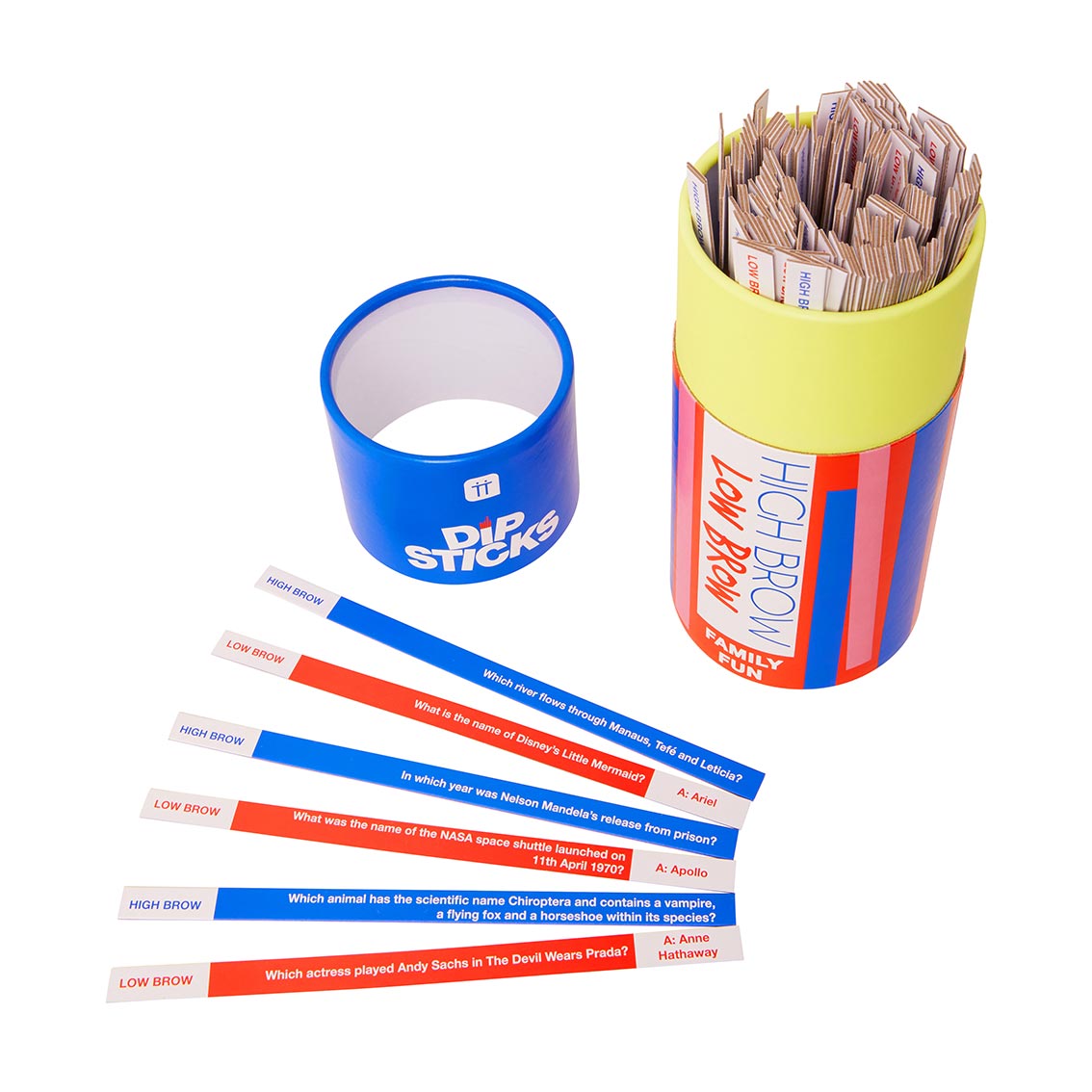 | The High Brow Low Brow Dipsticks Game by Talking Tables. Dip in, pick a stick and let the head-scratching fun begin. Take turns testing your knowledge in a game where the questions are different but the answers are the same! Can you answer the high brow question for two points? If not, flip the stick and attempt to answer the low brow question for one point. The perfect game to play with family and friends. Contains 160 double sided question sticks Recommended for age 7+ and 2+ players |