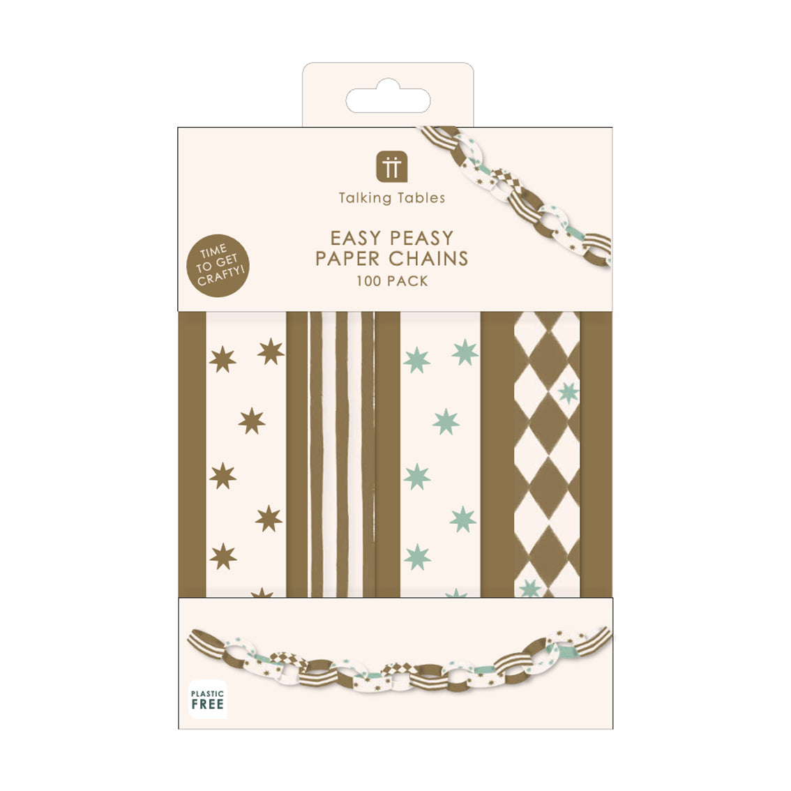 A classic Christmas decoration reworked with a calmer, more considered colour palette. Featuring gold and cream tones with a subtle hint of winter blue, these paper chains combine stripes, stars and on trend harlequin prints for a look that feels current but familiar. Designed to be easy to assemble, each link uses slots and tabs so no glue is required. With enough pieces to create over 6.5 metres of chain, this pack offers flexible styling for mantels, staircases, doorways and shelves.
