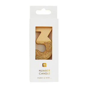 Celebrate your special big day with this number 3 gold glitter dipped candle. Mix and match with other numbers, also available in blue and pink. Perfect for popping on a special birthday cake!