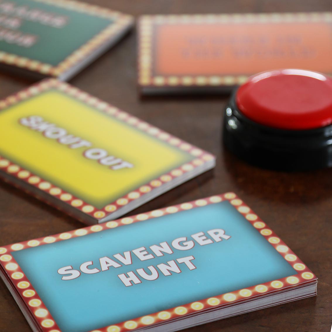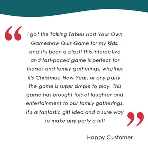 A great addition to any family games night. Host Your Own Family Game Show is a fun and fast paced game and has teams buzzing in to win points. Great for Christmas day or any other gathering with family and friends. There are five different rounds: Shout Out, Scavenger Hunt, Say Another Way, Strange or Fiction and Where in the World and wild and whacky bonus rounds to double points and take the lead. Suitable for all ages great and small!