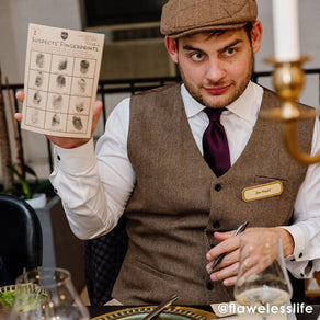 Inside the box, your customers will find a whole array of themed props, clues and weapons to set the scene in their own home. The host reads out the welcome speech to introduce the characters and unfold the story. There is a specific character for the host to play (Alex Cited - the host is not a suspect but still a participant) and the victim is not a guest - pages 3 & 4 of the instruction booklet give more detail. Players must work together to solve the clues and identify the murderer before they strike again!