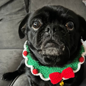 This Christmas dog collar is aimed at the dog mums and dads who can't resists an adorable dog accessory or photo opportunity. Place the crochet collar around the neck of a small to medium sized dog and tie a bow, ensuring a comfortable fit. Crocheted from red and green yarn with a bow tie and jingle bell, this Christmas dog accessory is perfect for family Christmas cards or for wearing throughout December.