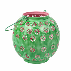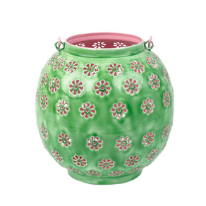 This large decorative enamelled lantern will make a bold and bright addition to your range of tableware, home décor and garden accessories. It’s made by hand in India and consists of a pink inner and green glazed outer shell which has been cut into to create little geometric flowers – a pretty way for the candlelight to glow through. A metal handle makes it easy to transport.