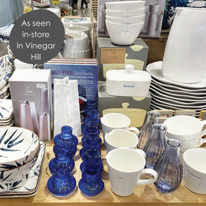 Striking yet timeless, this blue glass candle holder makes an eye-catching table decoration, gift or statement home accessory. With a geometric, ribbed glass design, our small candle holders will hold a straight dinner candle or spiral candlestick for customers looking to add an artsy touch. Its bold blue colour makes this glass candle holder perfect to sell all year round or highlight in a summer collection of Mediterranean blue.