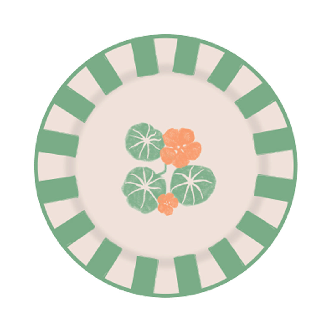 Designed within the Bon Jardin range, the Nasturtium Enamel Plate celebrates the link between the kitchen and the garden. Featuring hand-painted green stripes and a bold nasturtium motif in soft orange tones, it brings warmth and colour to the table. Each plate is hand-dipped multiple times in enamel and fired at high temperature for a smooth, durable finish that’s made for everyday use.