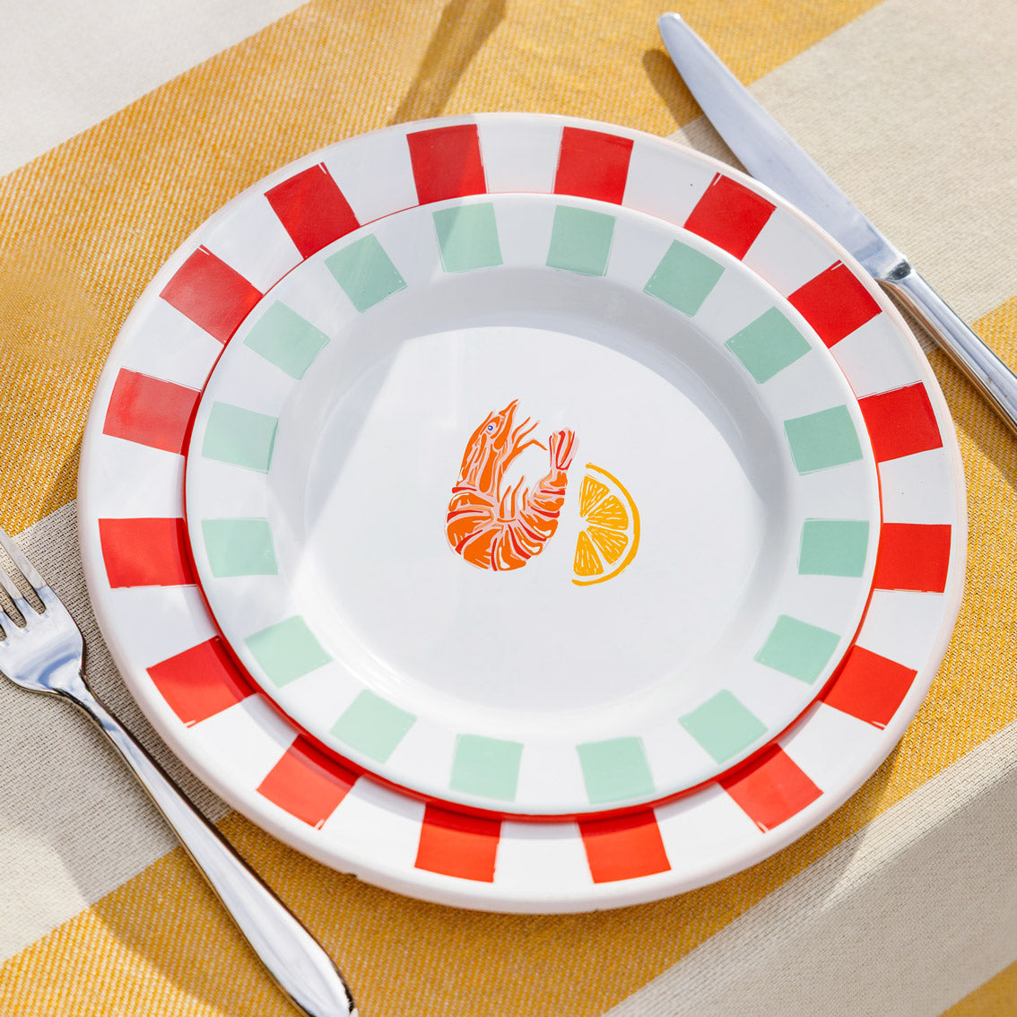 Part of the Bon Appetit collection, this Shrimp Enamel Plate captures the relaxed feel of bistro-style dining at home. The design features a bright on on-trend shrimp and lemon motif. Made from heavy-grade steel, each plate is hand-dipped multiple times in enamel and fired at high temperatures to achieve its bold colour and smooth, durable finish. Hardwearing and reusable, this plate is ideal for serving seafood, summer dishes or casual meals indoors and out.