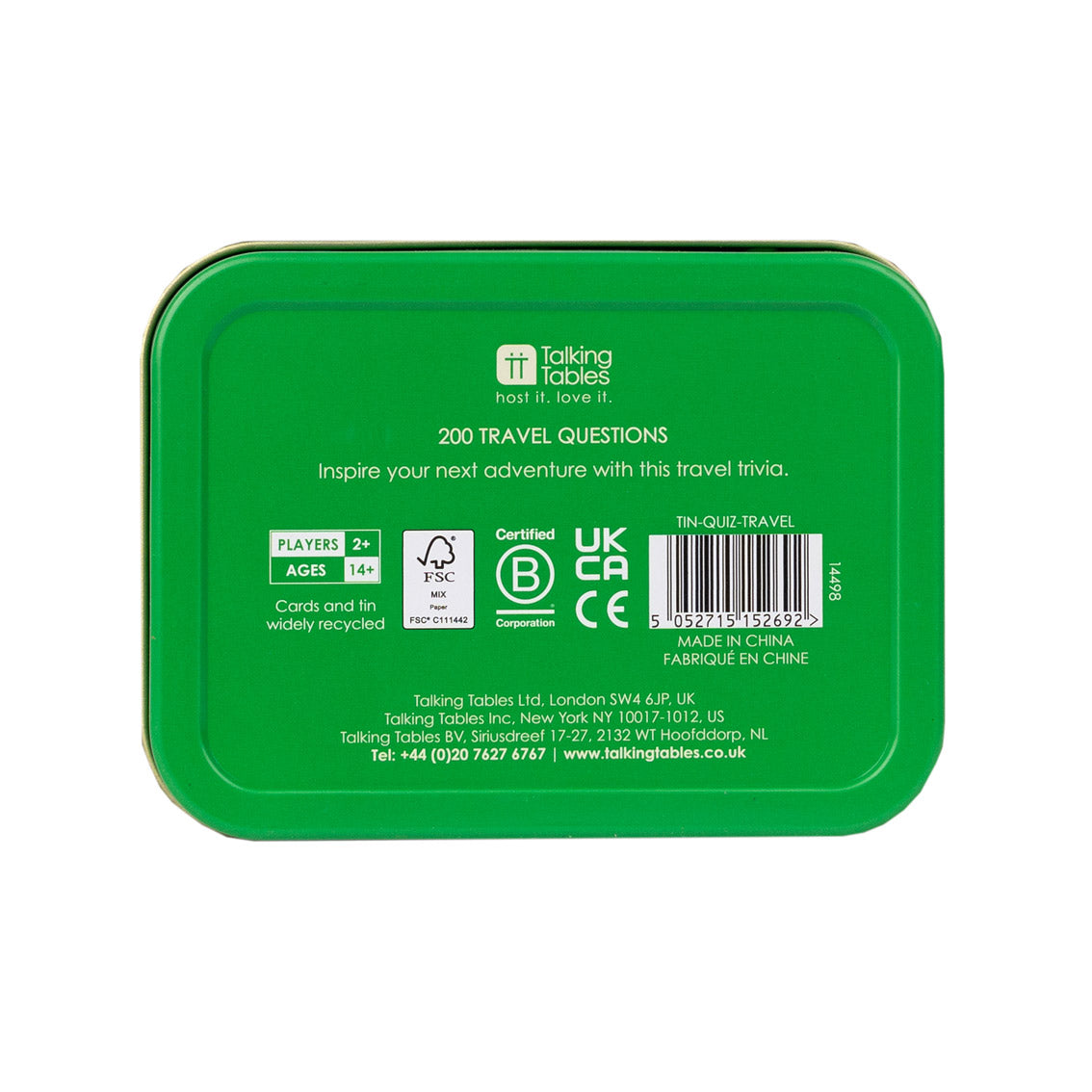 Calling all jetsetters and globetrotters. For customers hungry for adventure and eager to put their knowledge to the test, look no further than Quiz in a Tin - Travel Trivia. Packed with questions about iconic countries, bustling cities, and renowned landmarks, this quiz will have players globetrotting from the comfort of their own home. Its small size also makes it an ideal companion for endless entertainment on those travel days. It's the perfect passport to a world of knowledge and fun!
