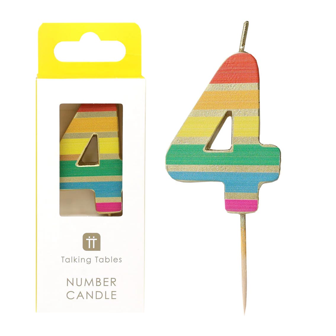 Add a bright touch to your customers birthday cakes with our new 4 rainbow number candle. Designed to bring colour and excitement to any birthday celebration and a must-have for bakeries, party shops and gift shops. The multicoloured numbers and striped design will suit birthday cakes of all ages and genders.