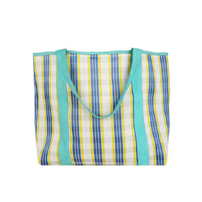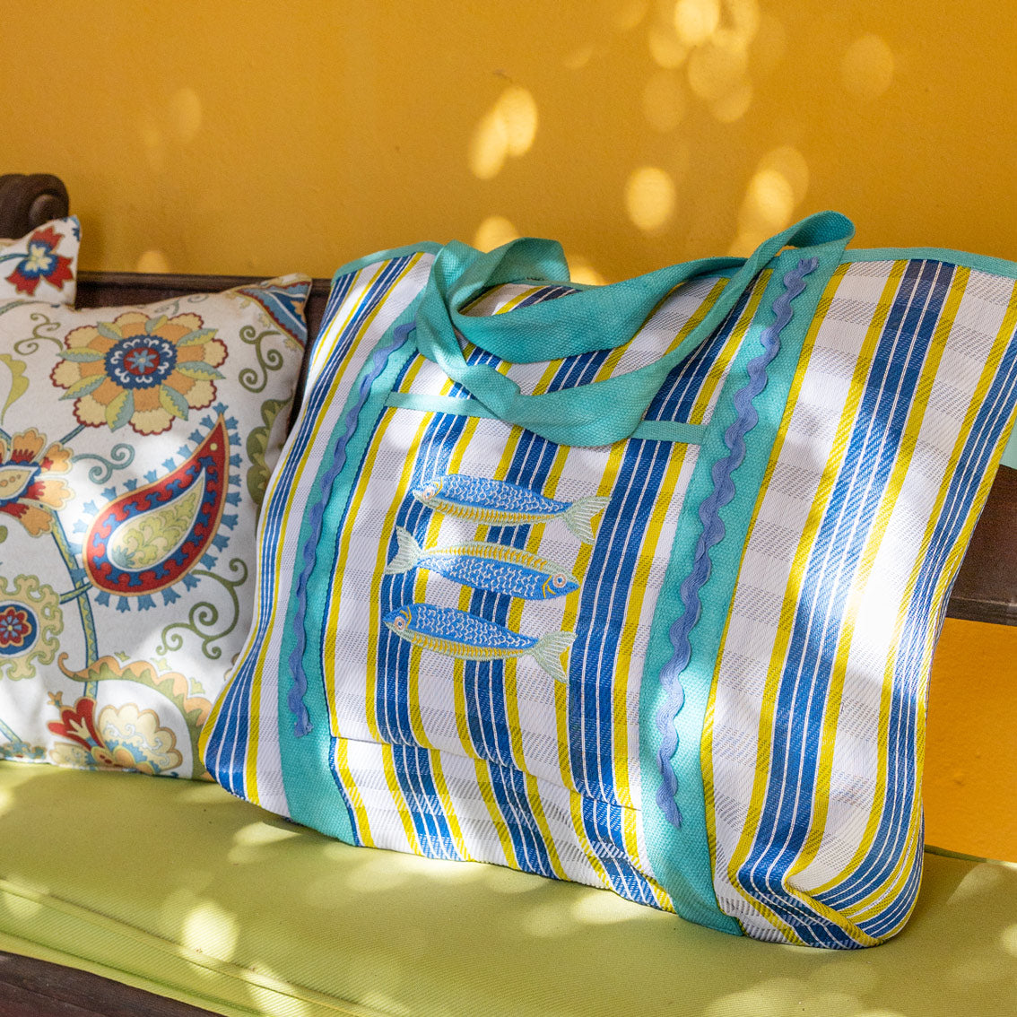 Created with the Fishermancore trend in mind, this Recycled Plastic Fish Tote Bag brings coastal charm to everyday living. Made from recycled plastic materials, each bag is crafted by transforming used cement bags into durable, water-resistant threads woven into strong new fabric. The blue and yellow check pattern, embroidered sardines, and ric-rac trim capture the spirit of seaside bistro style while promoting conscious design.