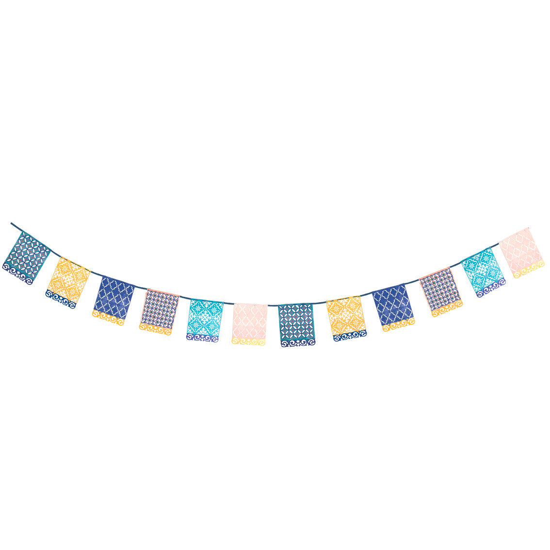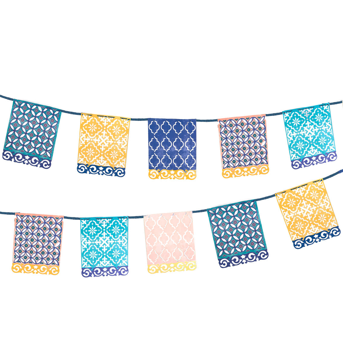 This papel picado paper garland comes in gorgeous blue, greens, yellows, and peach, inspired by the bright and vibrant tiles of Morocco. With 12 pennants, this Souk Blue Paper Garland will add impact to all your customers' gatherings and make hosting fun and easy this summer.