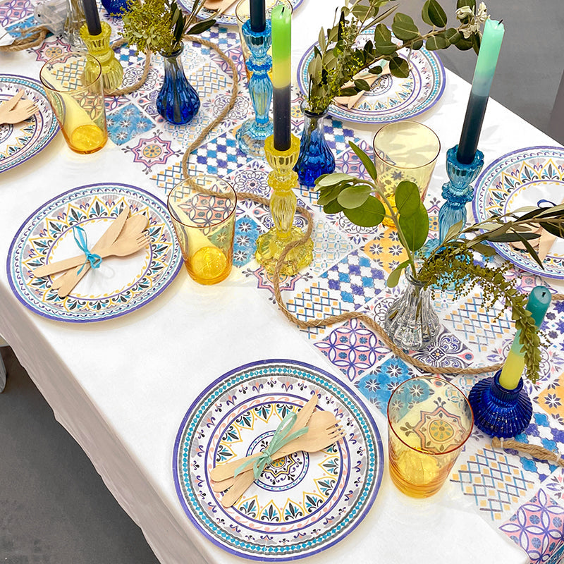 Merchandise with the Souk paper plates and recycled round rug and create a summer picnic essentials display. Or set a table display, pair with our wooden Souk trays and other tableware items.
