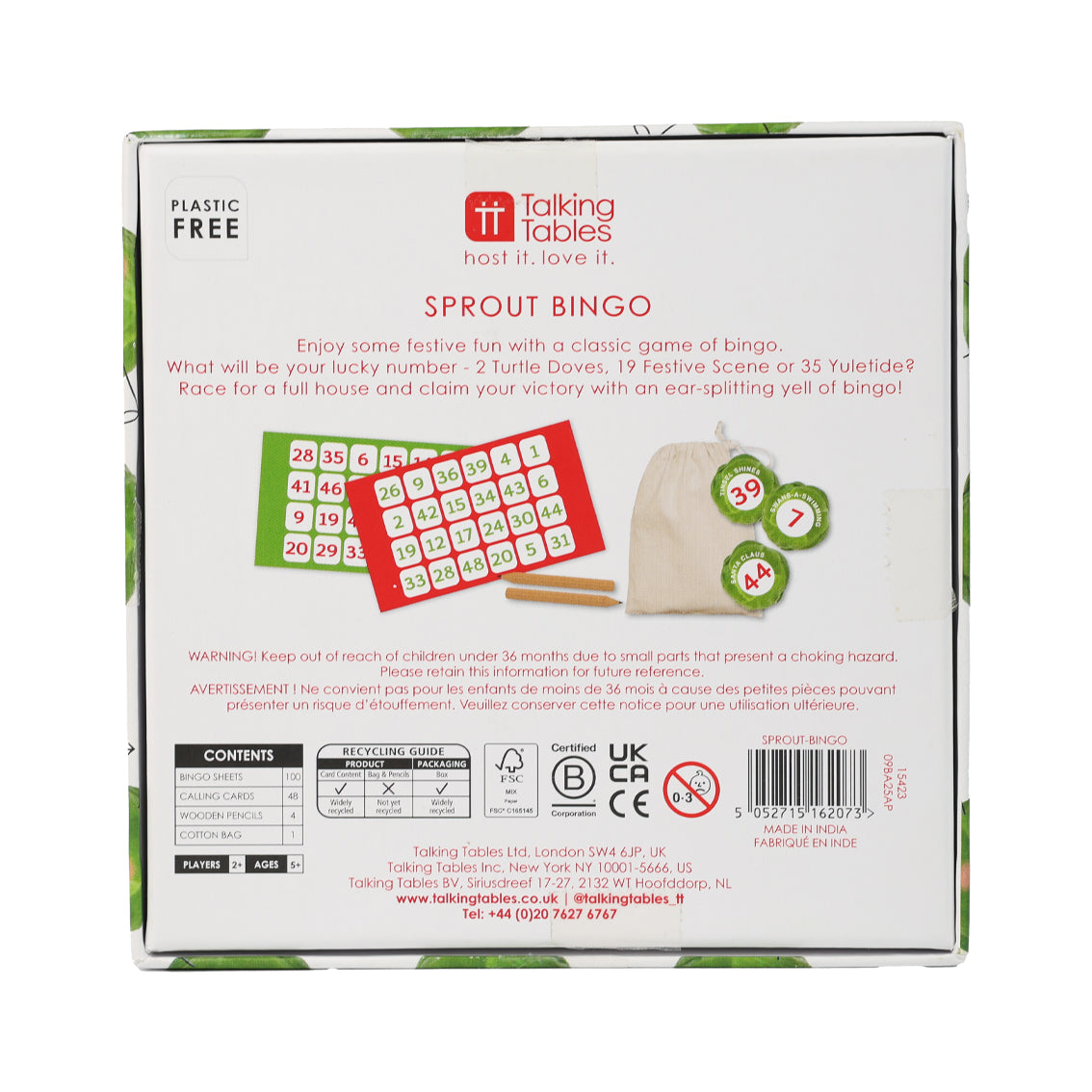Game Contents: 100 Bingo Sheets, 48 Calling Cards, 4 Pencils & Cotton Bag
